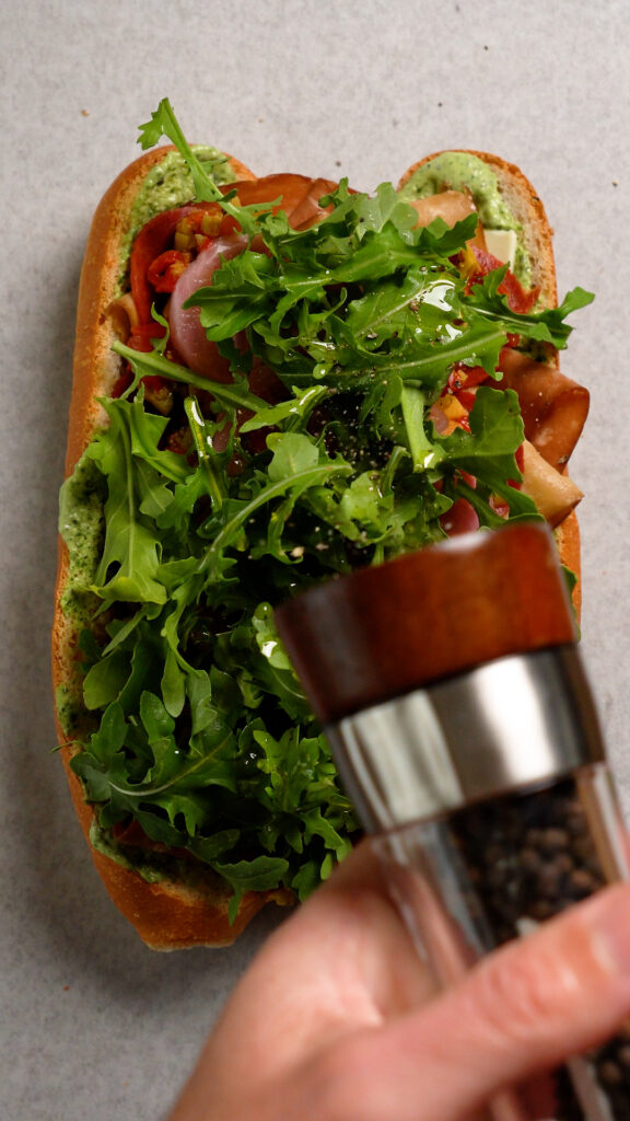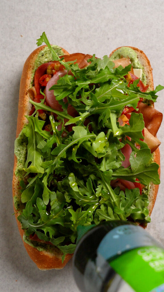 - Oil, Vinegar, Salt and Pepper – Every good Italian Sandwich has a nice splash of oil, vinegar and salt and pepper! I will typically do this over the arugula so it can coat the greens and make it’s way through the sandwich.