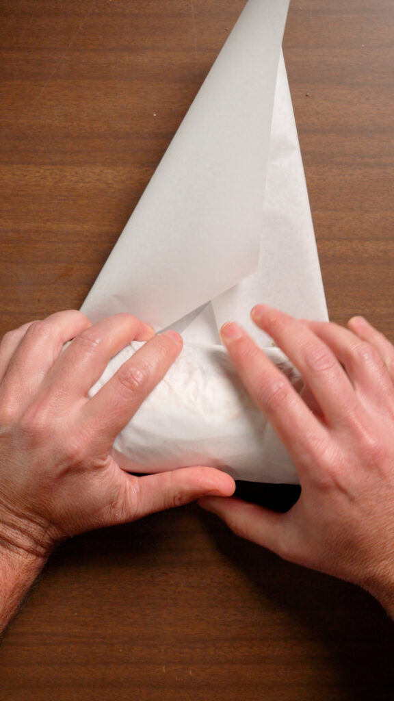 Close the sandwich, doing your best to keep all the fillings in. I highly suggest wrapping the sandwich in some deli or parchment paper. Compress it as tight as you can. Then cut it in half, peel back the paper and enjoy!