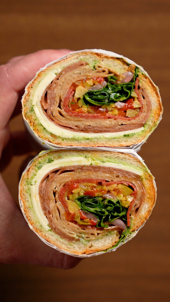 - Close the sandwich, doing your best to keep all the fillings in. I highly suggest wrapping the sandwich in some deli or parchment paper. Compress it as tight as you can. Then cut it in half, peel back the paper and enjoy!