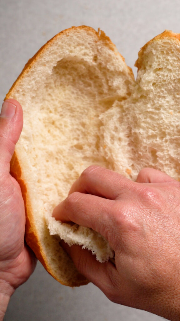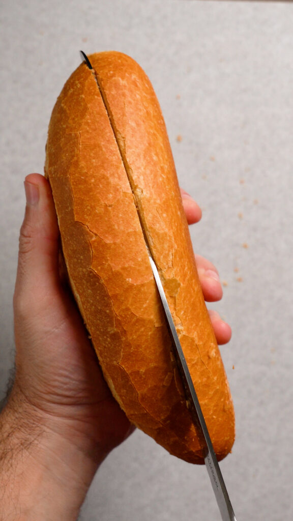 - First, split your roll. You can scoop out some of the inside if you like if you want more filling and less bread. Up to you, but I typically scoop it out a bit.