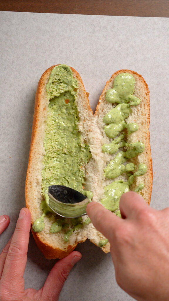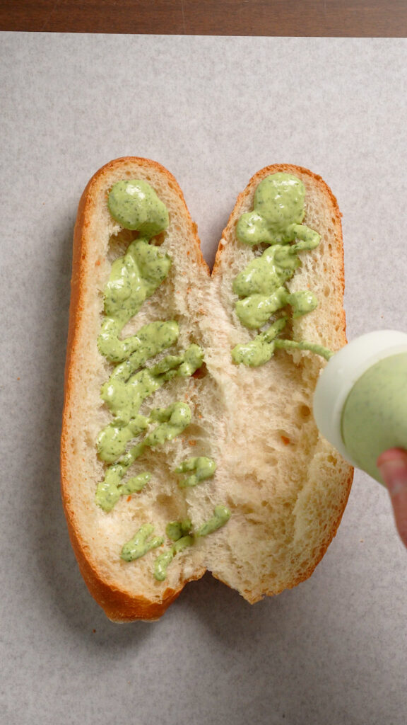 - Then slather on a good amount of the Basil Mayo on both sides.