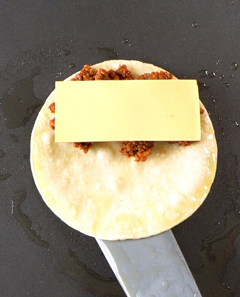 They just slap a piece of American cheese on these, and it kinda melts. But that doesn’t really work with Vegan American cheese. I suggest adding half a slice into your taco before frying.