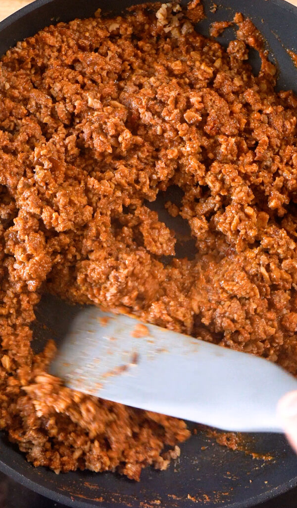 - If using plant based meat, cook over medium high heat until browned to your liking, breaking up the meat into a small mince.