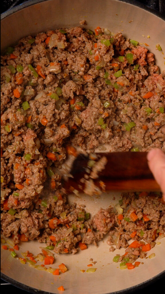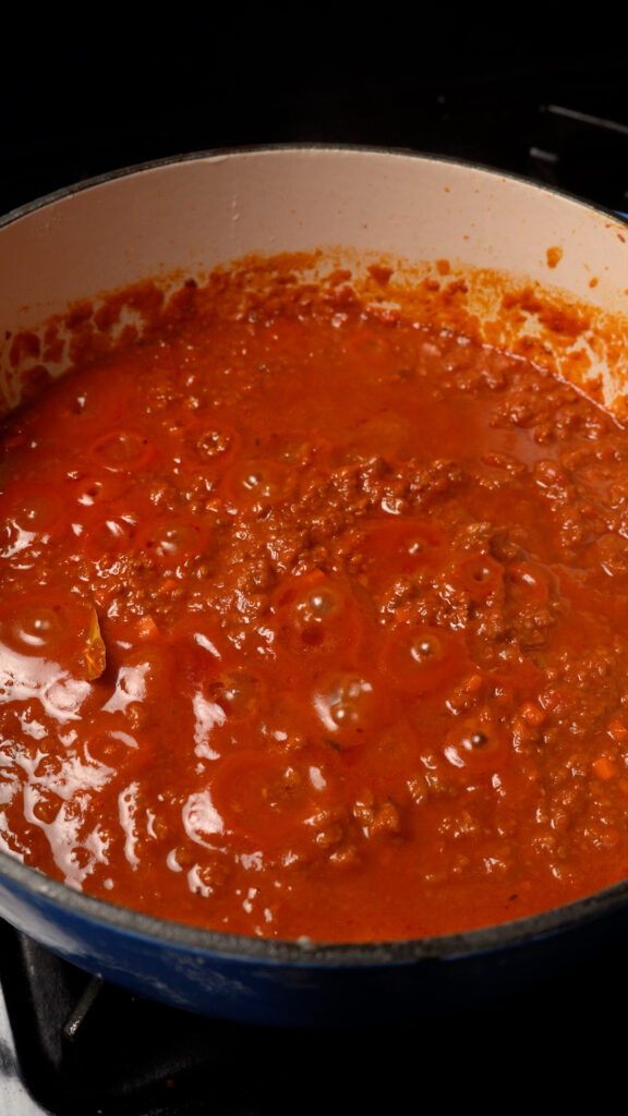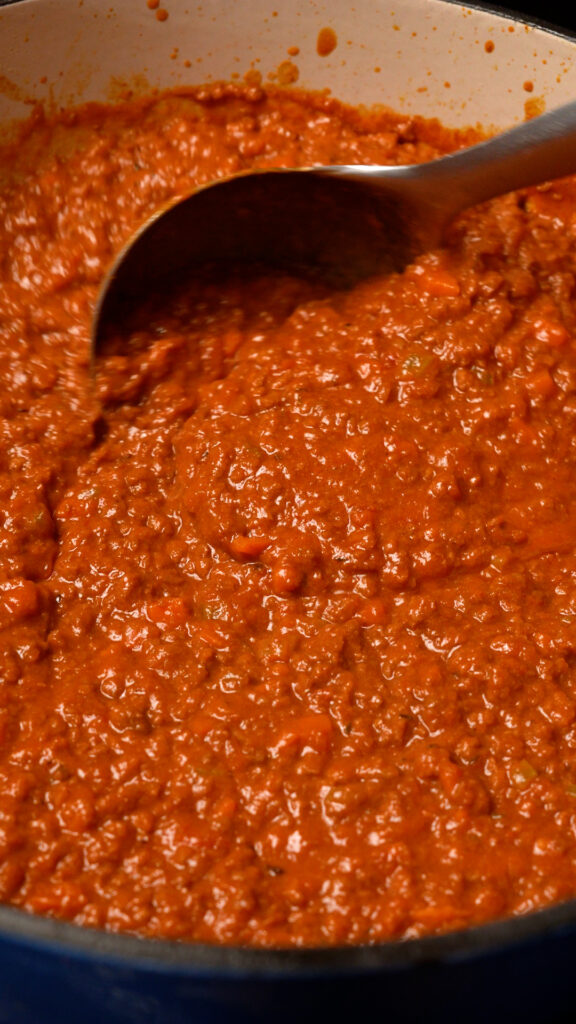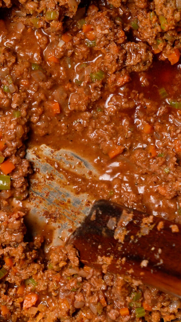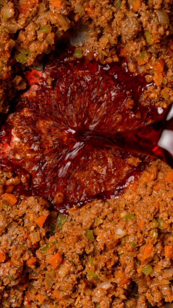 - Add in the Red or White Wine (or Tomato Sauce or Veggie Broth) and stir to incorporate. Scraping any brown bits that have stuck to the pan (the fond). Cook for 3 minutes, then add the Crushed Tomatoes and the rest of the seasonings (Worcestershire, Nutritional Yeast, Calabrian Chilies and Italian Seasoning). Stir to combine.