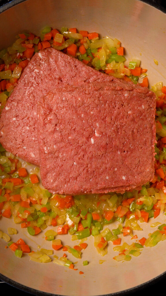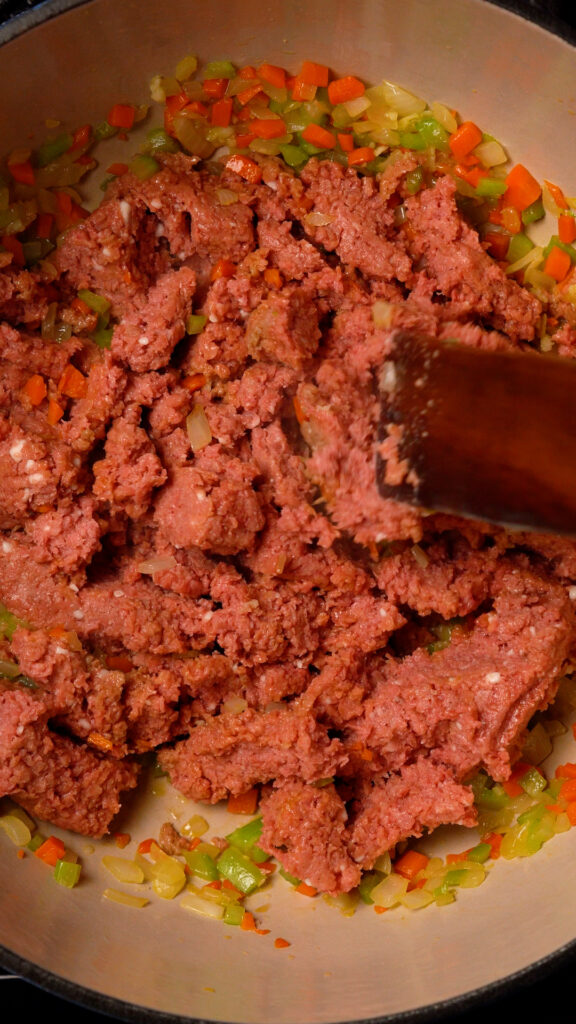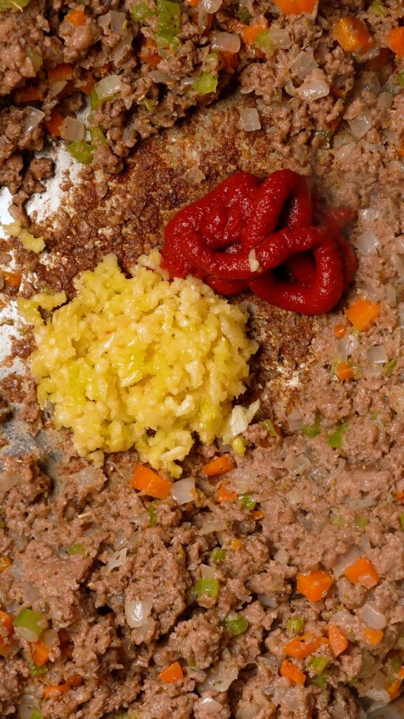 - Add the minced garlic and tomato paste. Stir and cook for 1 minute, then add in the plant based meat. Break it up into a fine ground and cook until browned.