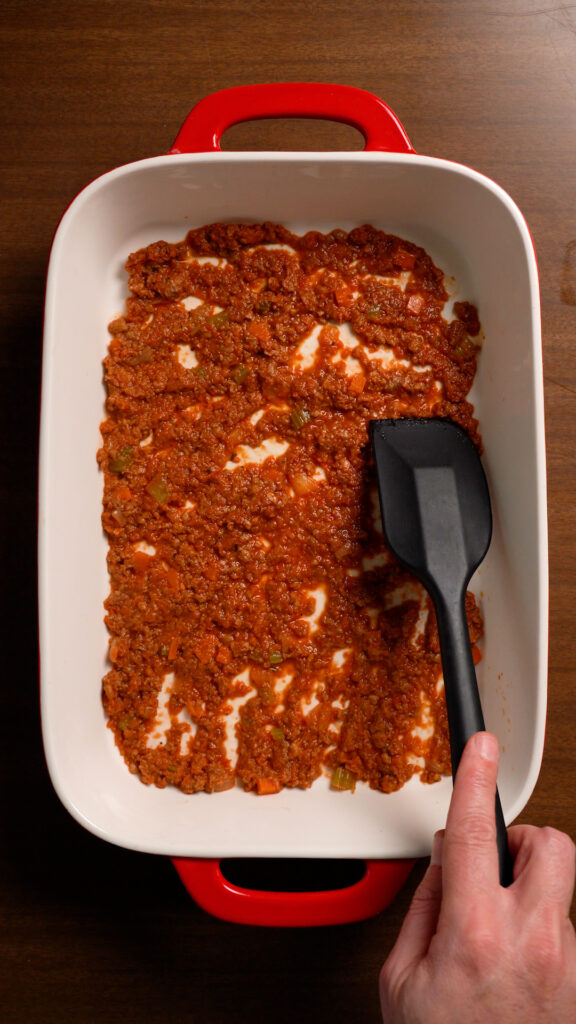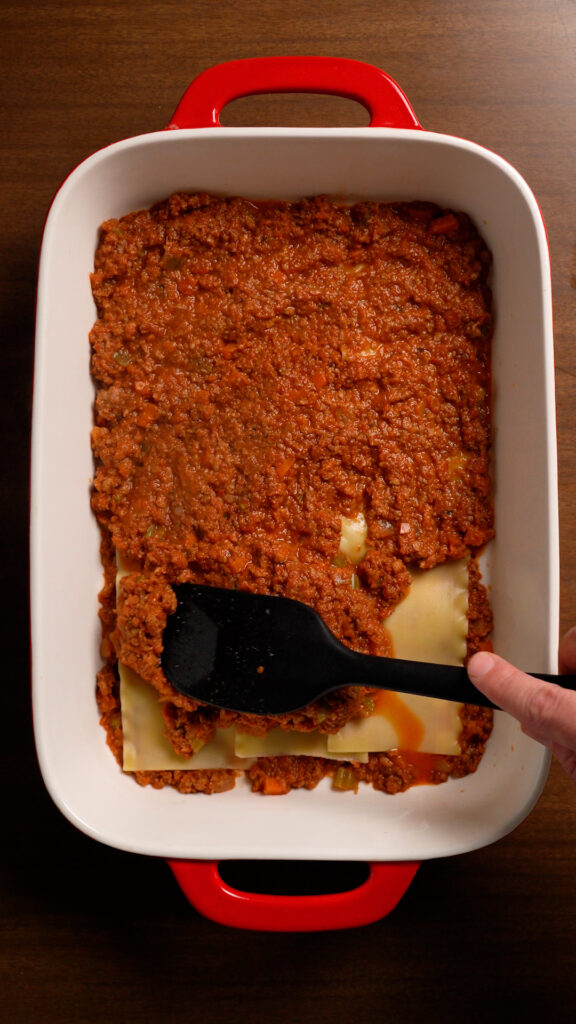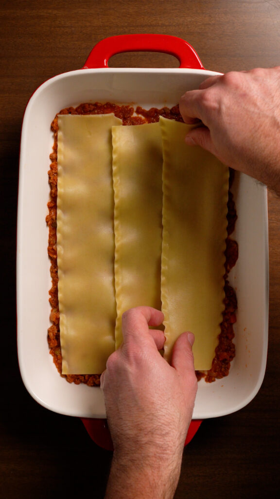 - To assemble the Lasagna, grab a 9×13 pan, and start with a thin layer of sauce. Then add 3 Lasagna Noodles. Do 2 heaping cups (about 500g) of the sauce. Make sure to completely cover the noodles so they don’t dry out.