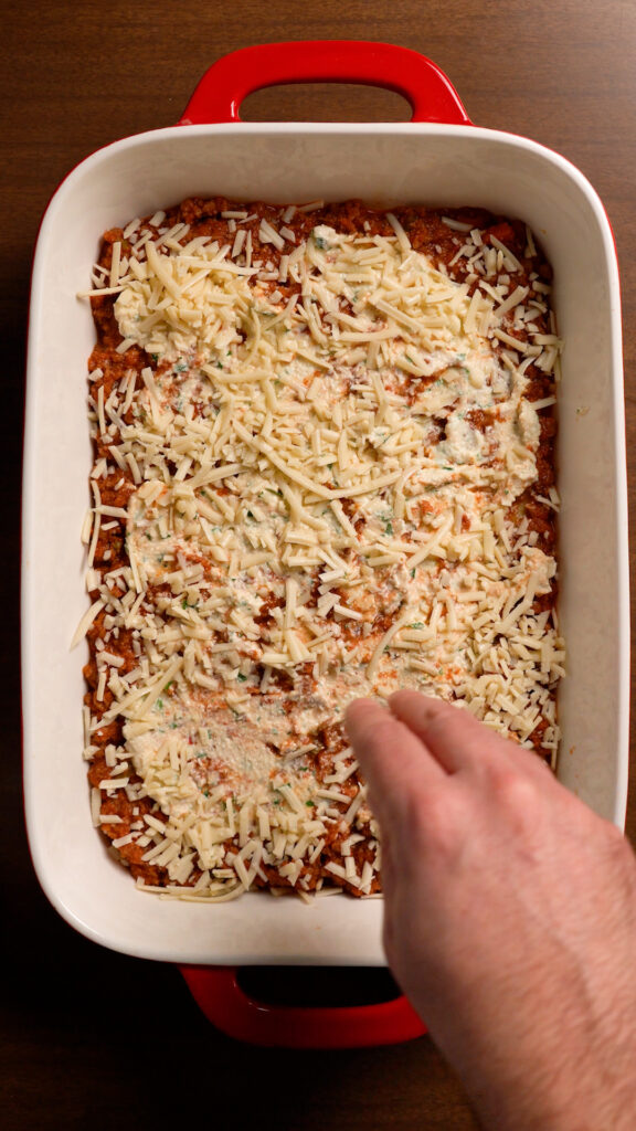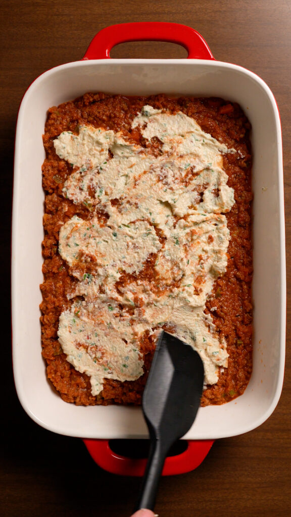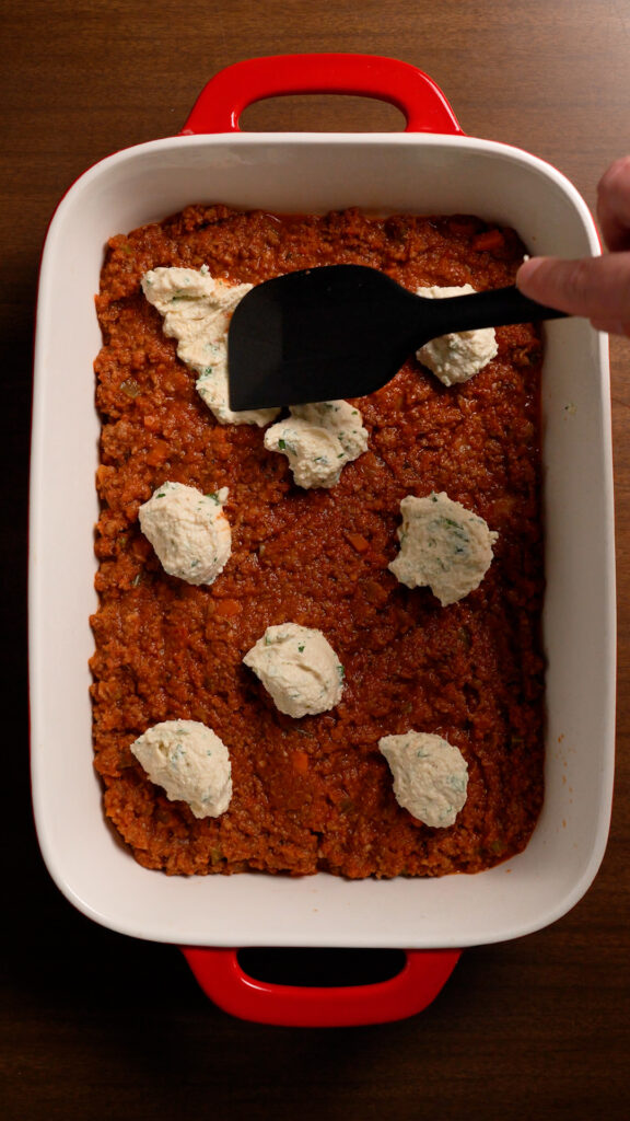 - Then spread about 1/2 cup of Tofu Ricotta (or store-bought Vegan Ricotta). I will do dollops and then spread it as evenly as possible. Doesn’t have to be perfect! Next add a layer of Shredded Vegan Mozzarella (about 1/2 cup)