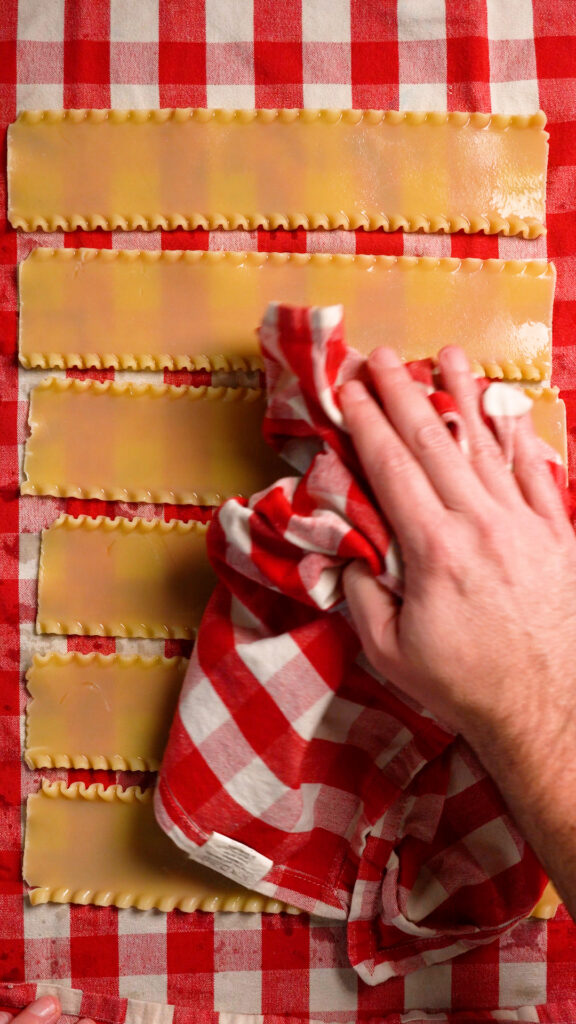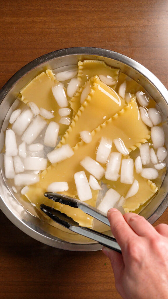 - After pasta is cooked, drain and cool either under cold running water, or you can do an ice bath. Either way, pat them dry with a clean kitchen towel or paper towels.