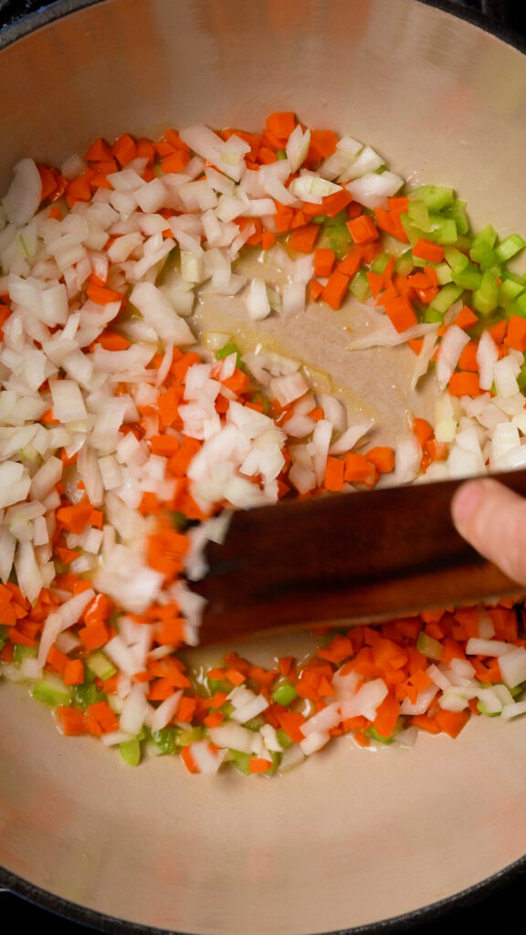- In a dutch oven or large heavy bottomed pot, melt the vegan butter and Olive Oil over medium heat, add in the onion, carrot and celery. Add a pinch of salt, stir to coat and cook until the veggies have softened, about 10 – 12 minutes.
