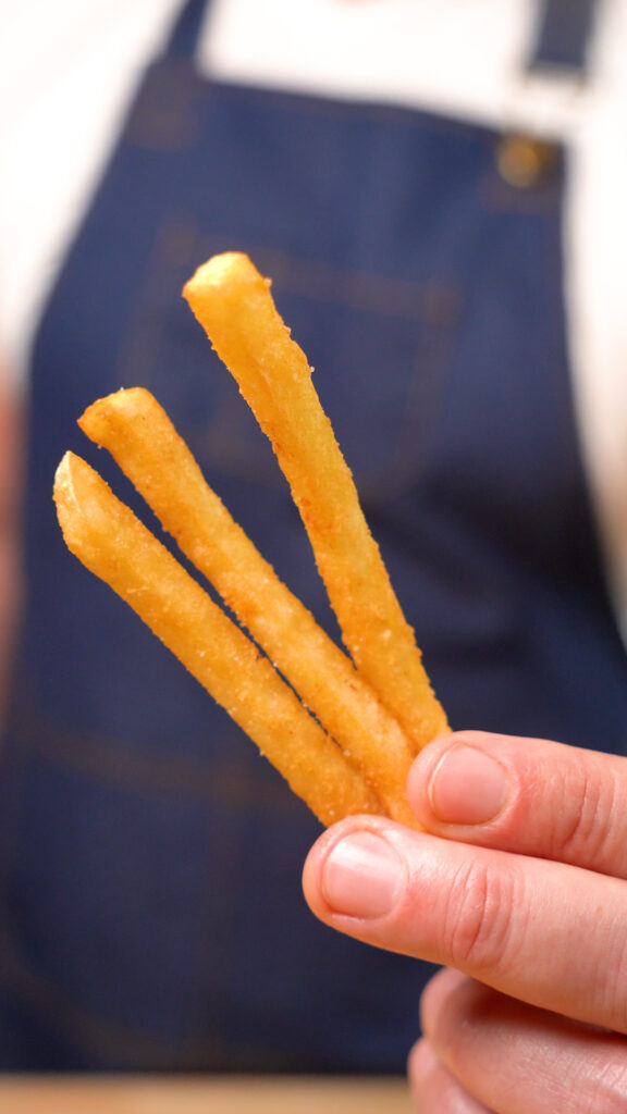 Then we’ll get some neutral oil up to around 350 F and fry our fries! They might splatter a bit since we got some liquid on them, but fret not, it’ll only last a few seconds. Fry them until golden brown and beautiful!
