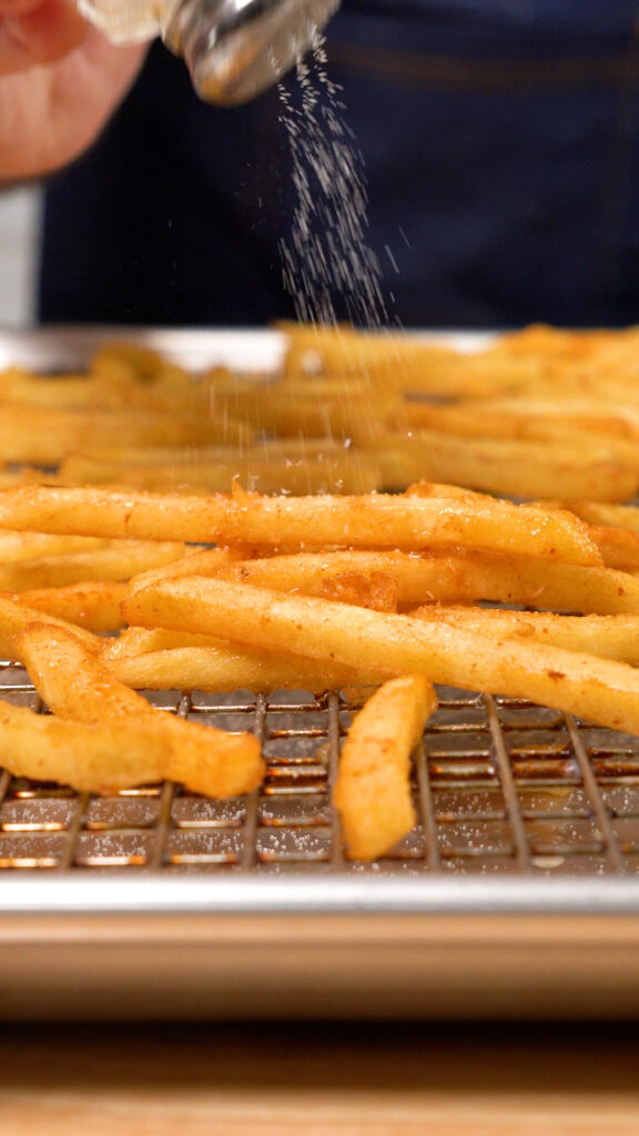 - Remove fries from oil and let them rest on a wire rack and salt to taste immediately. Enjoy while they are fresh!