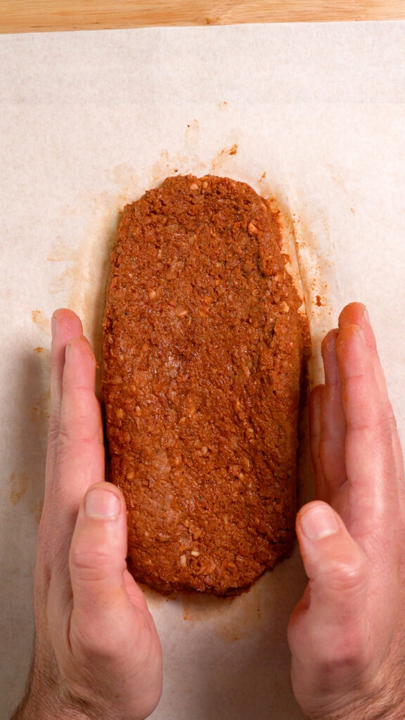 - To form your patties, weigh out about 6 oz. of the jackfruit / meat mixture per patty. Use some parchment paper so they don't stick to the surface, and form your patties with your hands. Make sure you have a hoagie roll nearby so you can shape them to the same length and width of the roll.