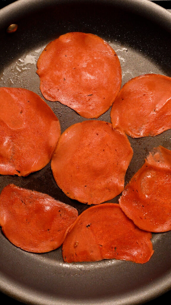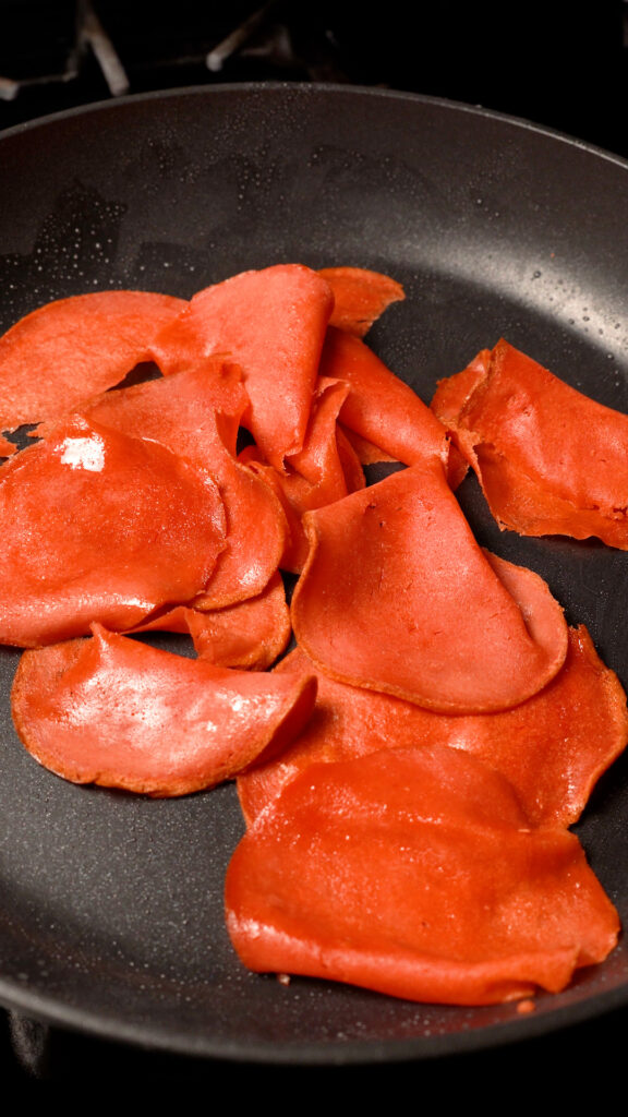 - Also, optional but recommended, heat up the slices of vegan ham in a pan until warmed through.