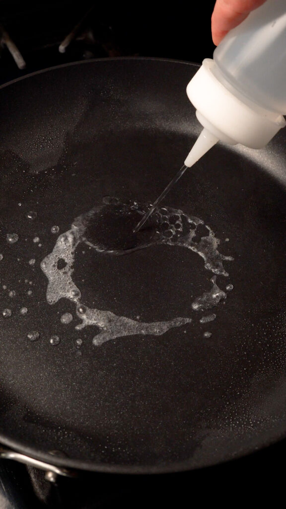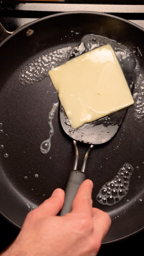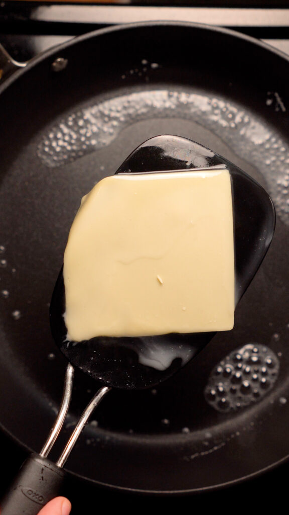 You can add the cheese at this point, but in my tests I found that it doesn’t really melt as much as I’d like. So this is optional, but I like to pre-melt the cheese by adding some water to a heated non-stick pan, then the cheese. The water will steam and melt the cheese and keep it from sticking to the pan. Then you can scoop it up with a spatula and add to the sandwich. But this is totally OPTIONAL!