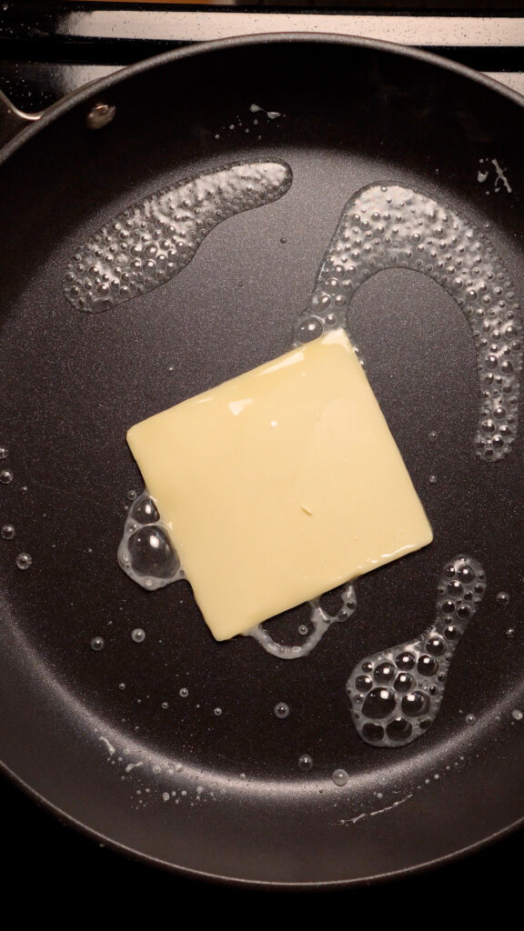 - Heat a non-stick pan over medium heat. Add 1 Tbsp of vegan butter. Once pan is preheated and butter is melted, dunk the sandwich in the batter on both sides. I do quick dunks, but if you want the bread to be softer and more custard like, dunk it for longer.