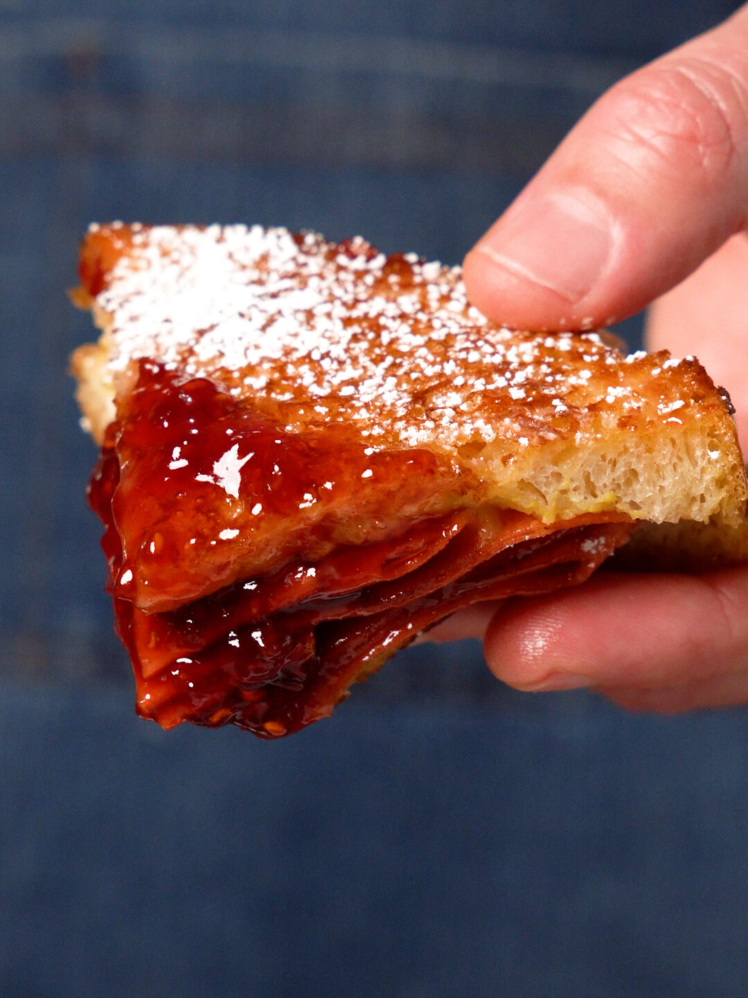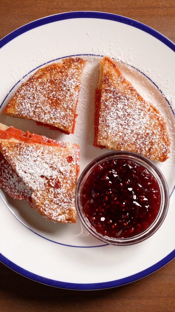 - Dust with powdered sugar, cut it into triangles or quarters, and dip it in some Raspberry Preserves and dig in!