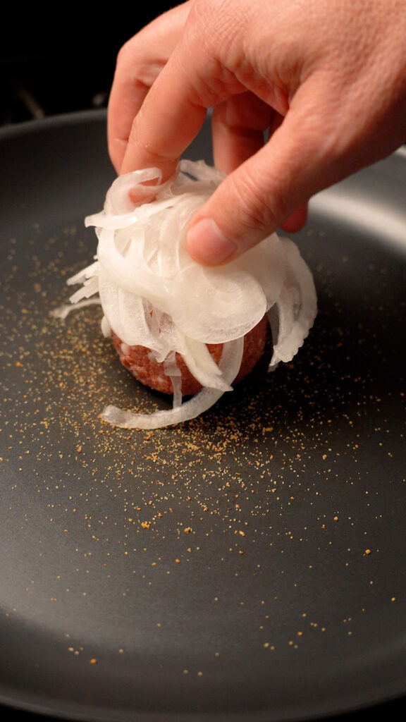 - Once pan is preheated (after about 3-4 minutes) add a ball of meat to the center. Season with salt or pepper (I like to use Lawry's Seasoned Salt). Then add about 1 – 2 ounces of the sliced onions. Season some more, then smash with a burger press or stiff spatula.