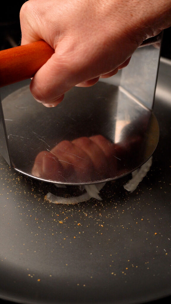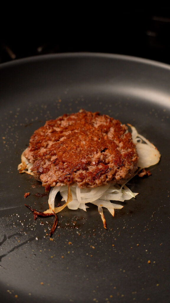 - Cook for 1 – 2 minutes or until you can see a nice layer of browning around the edge of the patty. Some of the onions will likely hang down and lay on the pan. If they are getting browned that is a good sign to flip too.