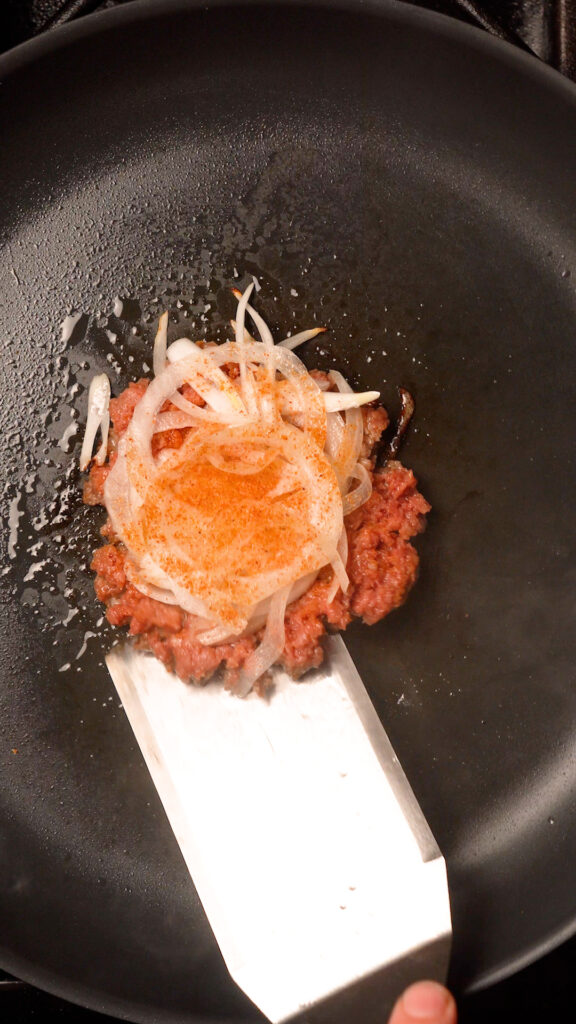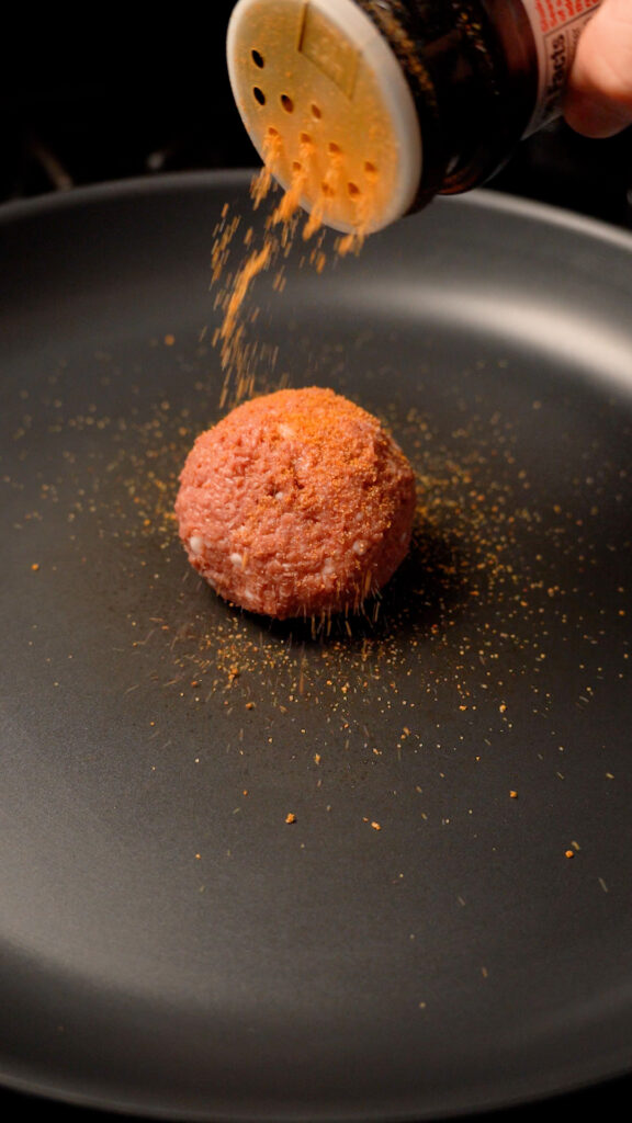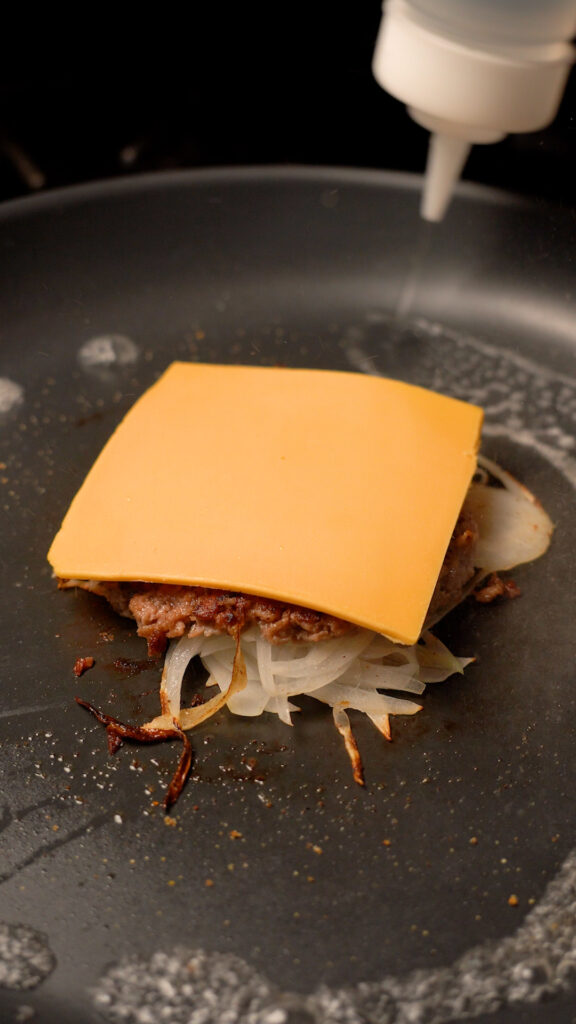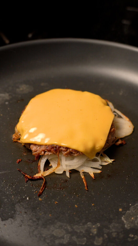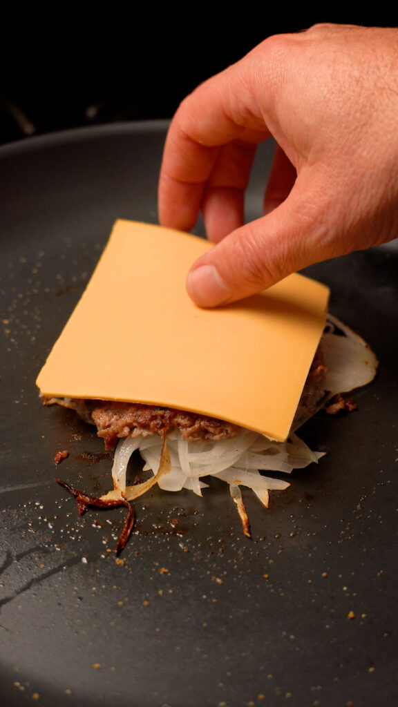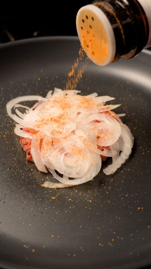 Once pan is preheated (after about 3-4 minutes) add a ball of meat to the center. Season with salt or pepper (I like to use Lawry’s Seasoned Salt). Then add about 1 – 2 ounces of the onions. Season some more, then smash with a burger press or stiff spatula.