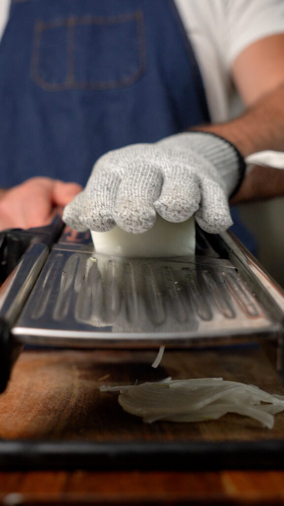 To slice the onions, I highly recommend using a mandolin to slice them as thin as possible. If you have a sharp knife and are good with it you can try that too. Either way, slice them as thin as possible.