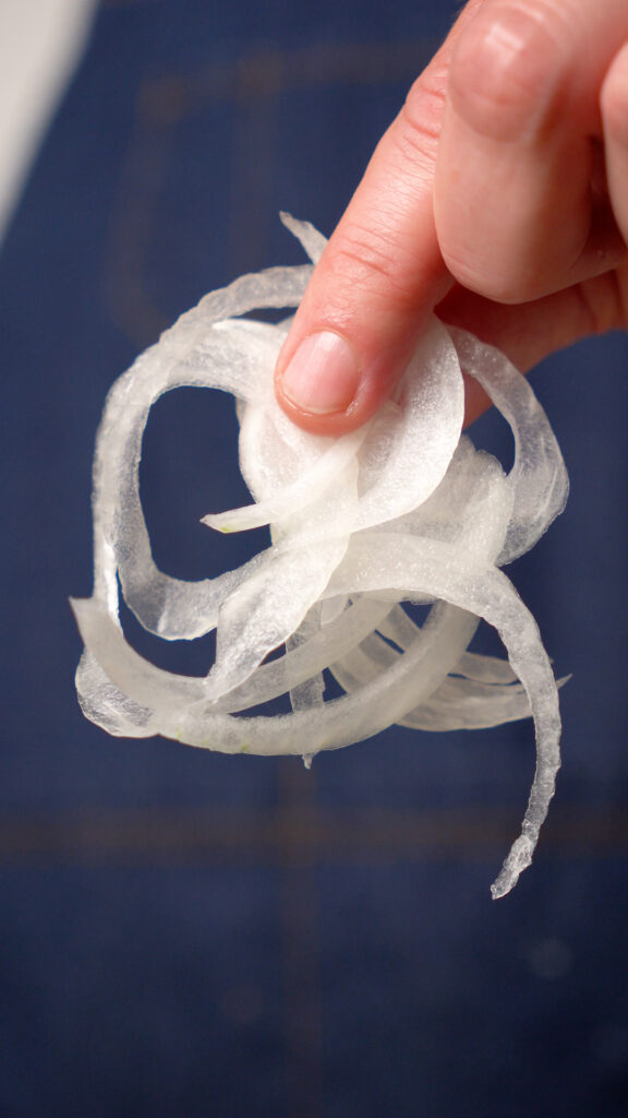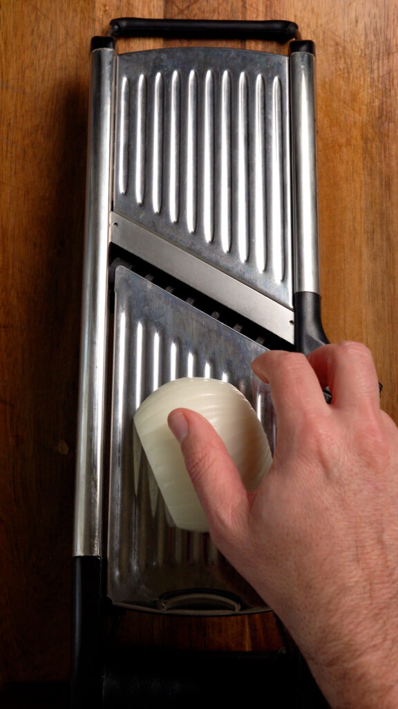 - To slice the onions, I highly recommend using a mandolin to slice them as thin as possible. If you have a sharp knife and are good with it you can try that too. Either way, slice them as thin as possible.