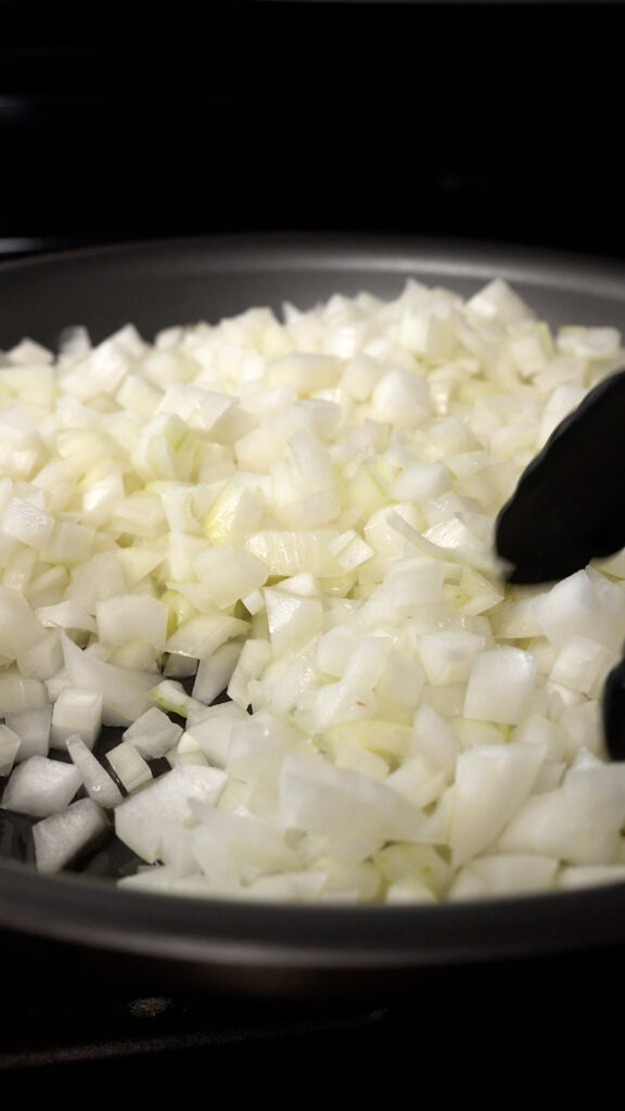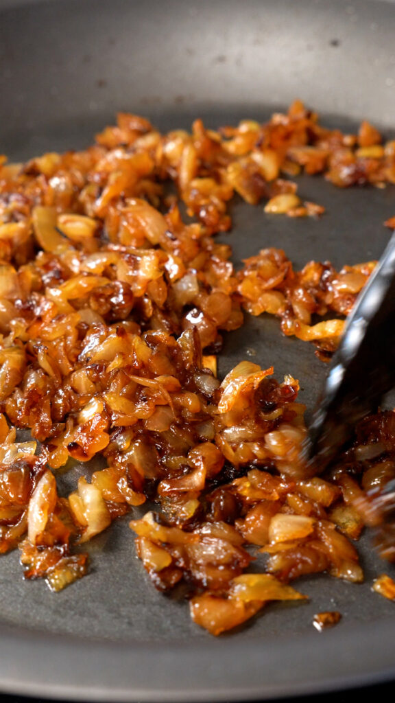 - Optionally, you can add 1 Tbsp of balsamic vinegar and 1/4 – 1/2 cup of vegan beef broth. Then just cook them down and reduce the broth. This will add some extra beefy flavor! Once they are done, remove from the heat and reserve. You should end up with about 3/4 cup of caramelized onions, if not more.