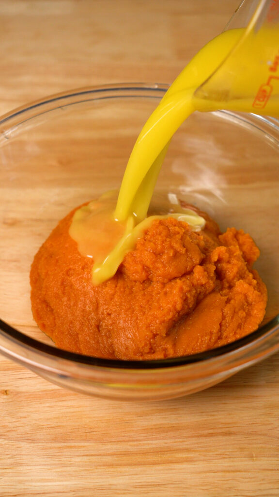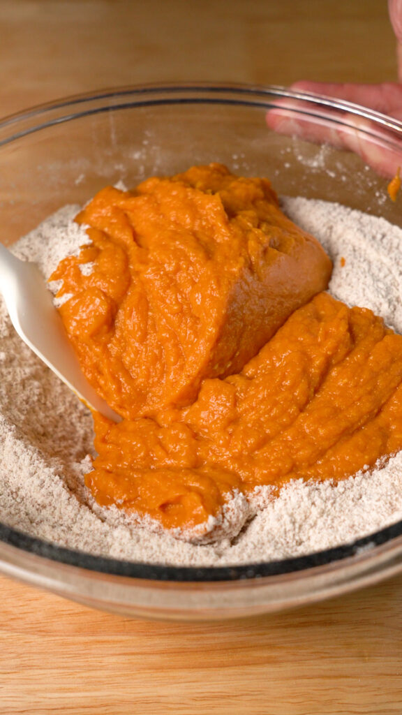 - Add the pumpkin puree and melted vegan butter to another bowl. Once the flax egg has thickened add it to the pumpkin and butter and whisk to combine.
