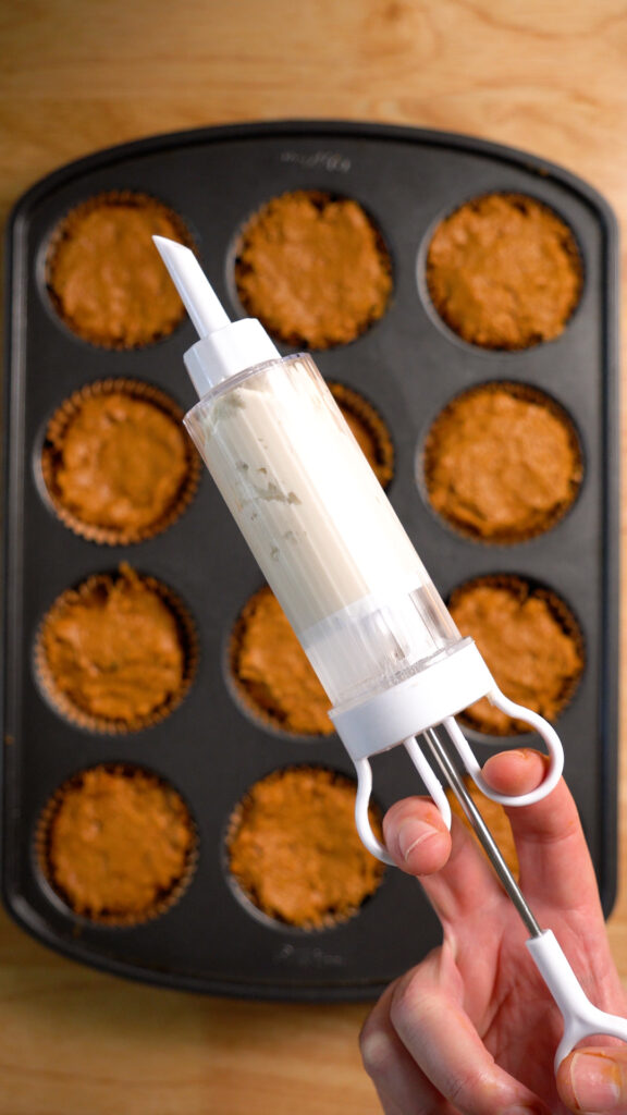 After that we’ll fill each one up with the cream cheese filling. You can use a piping bag, or ideally get a filling injector! If you can’t get your hands on either of these, you can also just add a dollop of cream cheese on top of each muffin.