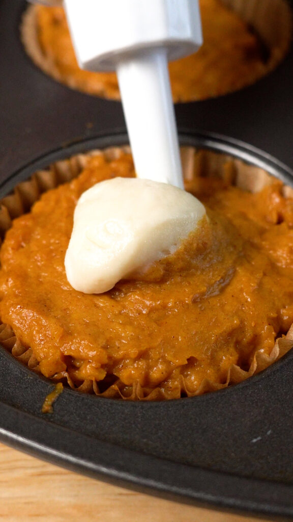 - Next, inject about 2 Tbsp worth of the cream cheese filling into the center of each muffin.