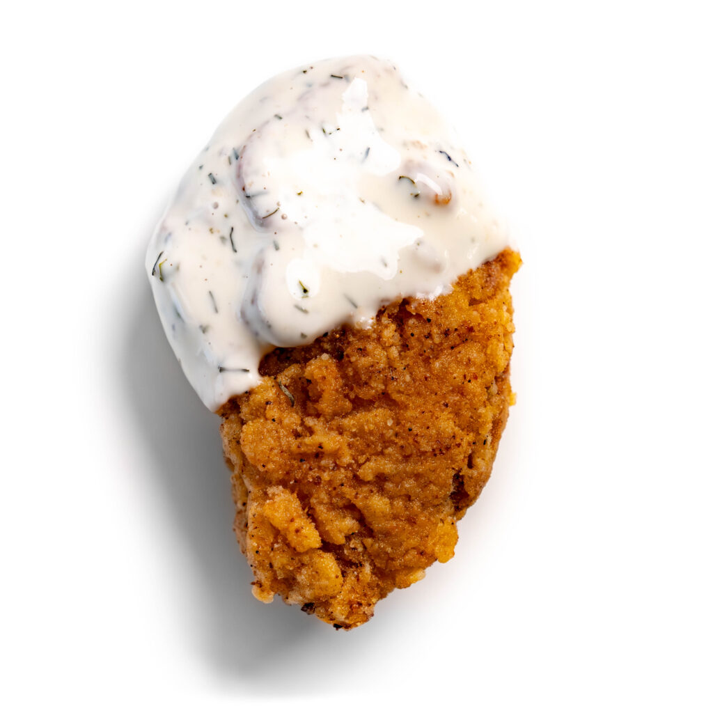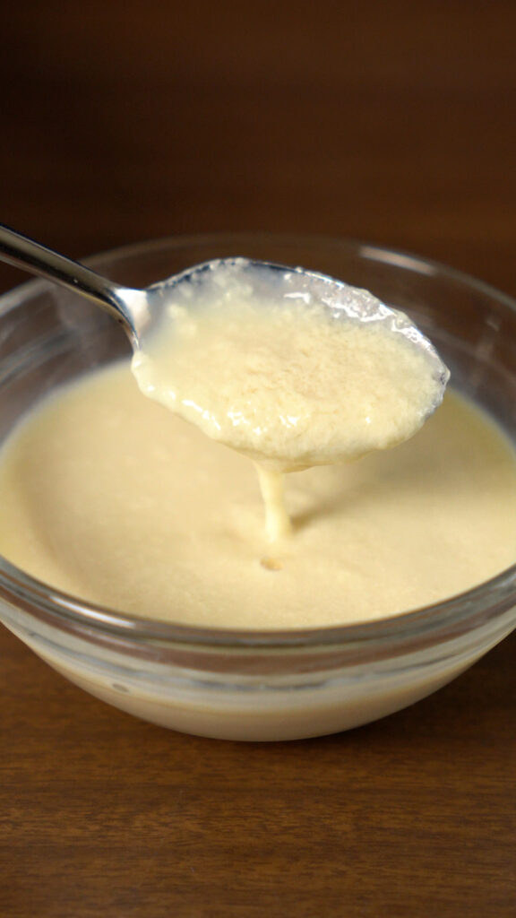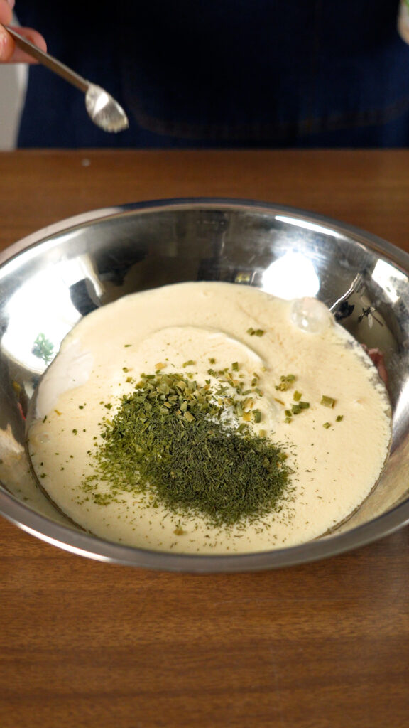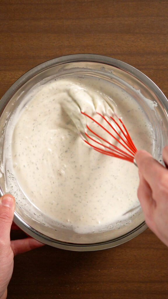 This is a fairly simple process, first make some vegan buttermilk by adding some apple cider vinegar to some plant milk and let it curdle. Then literally just mix everything up and taste for seasoning.