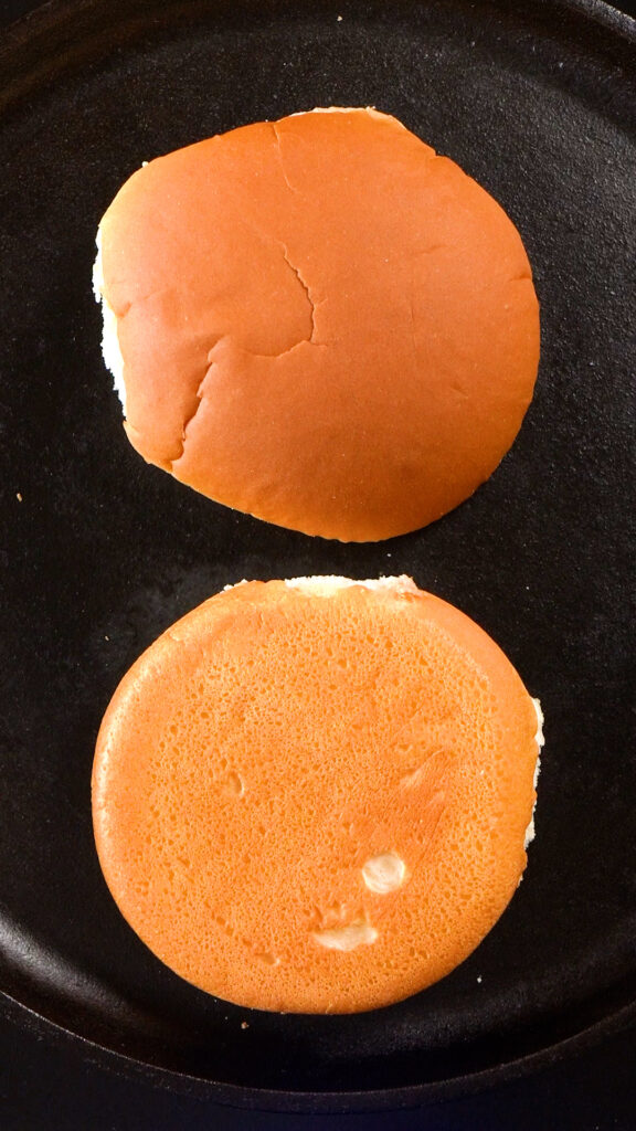 Get a cast iron or carbon steel skillet up to medium high heat. Toast the burger buns until golden brown and set aside.