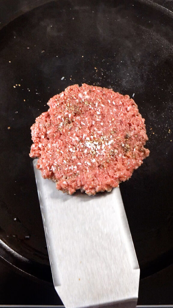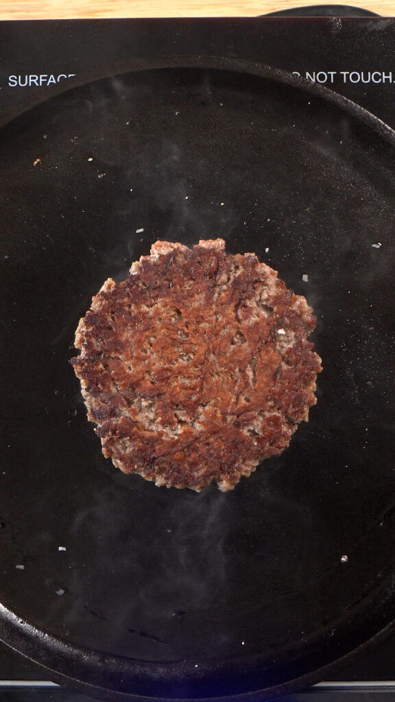 - Cook for 2 minutes (or less), you should see a deep brown layer at the bottom where the patty is touching the pan, that’s a good time to flip, so use your spatula to carefully, but confidently remove it from the pan and flip.