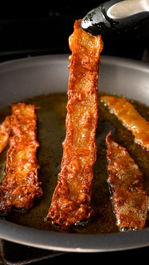 This is probably my new favorite combination of toppings! We’re gonna start with some Vegan Bacon.