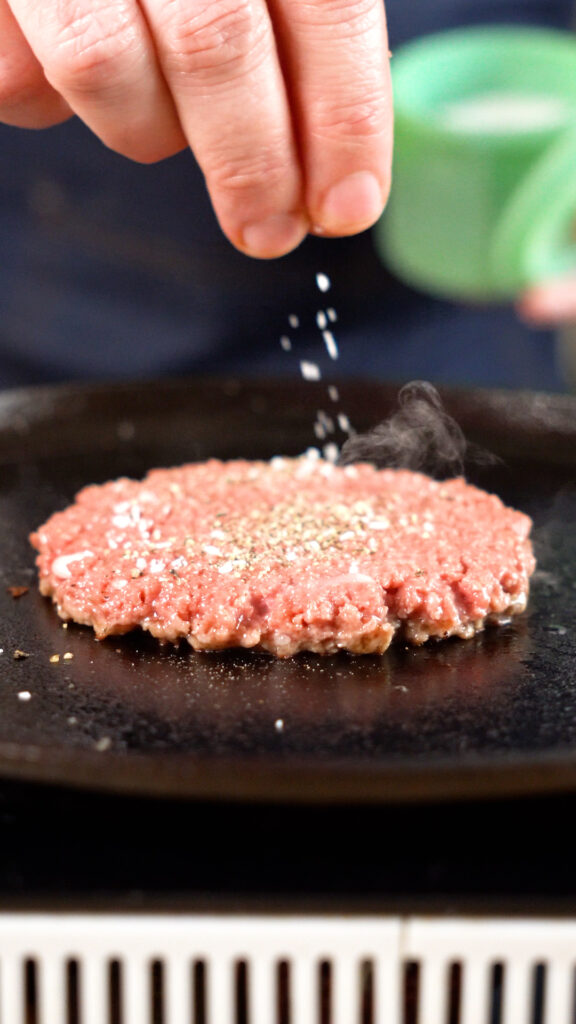 Season with salt and pepper. Cook for about 2 minutes or until you can see that the patty is browning.