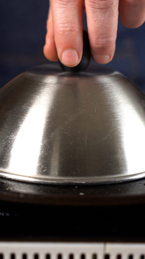 - Add Vegan American cheese, a few squirts of water, and then cover to steam and melt the cheese.
