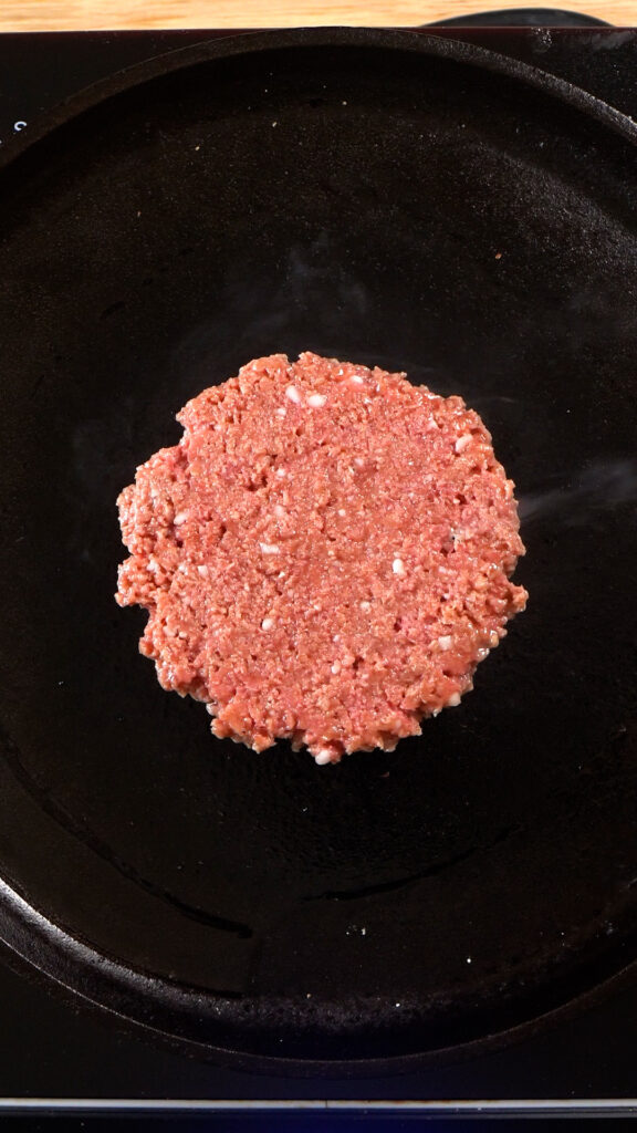 - Next, get the pan smoking hot, add a little bit of oil to the pan, spread it around with your spatula, then add a 3 – 4 oz. ball of plant-based meat. Smash it with a sturdy metal spatula or burger iron to about 1/2 inch thick.