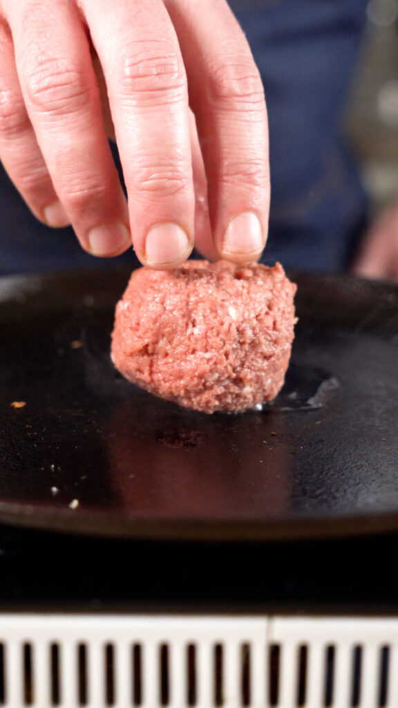 Next, weigh out your meat into 3 – 4 oz balls. Add a little oil to the skillet. Then add a ball of meat to the skillet and smash with a spatula or burger press.