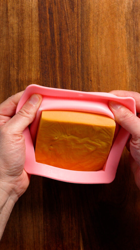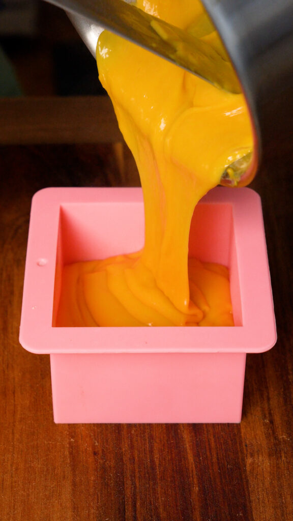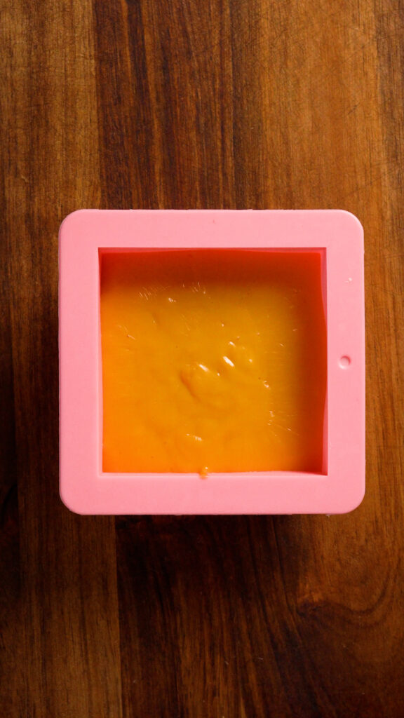 Then pour that into a non-stick container. I use a square silicon mold, but glass Tupperware should work too. You can also line something with parchment paper so it won’t stick if you’re unsure.
