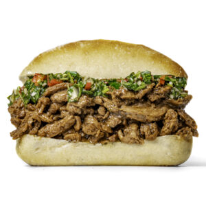 Taste and adjust for seasoning. Then toast your bread or roll, and slap that soy curl beef and chimichurri on top!