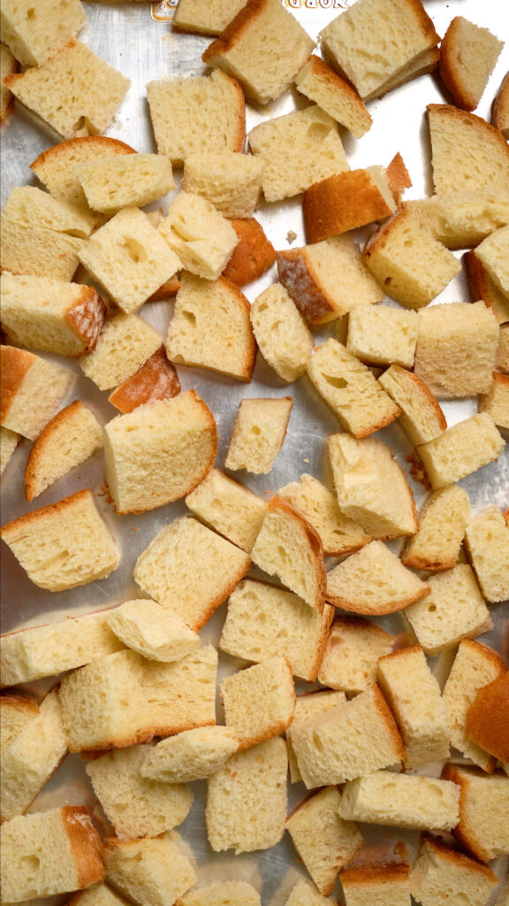 Cube up your white bread as big or small as you like, and add it to a sheet tray and bake at 350° F for about 20 minutes, tossing halfway through.