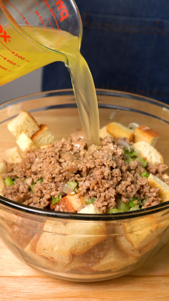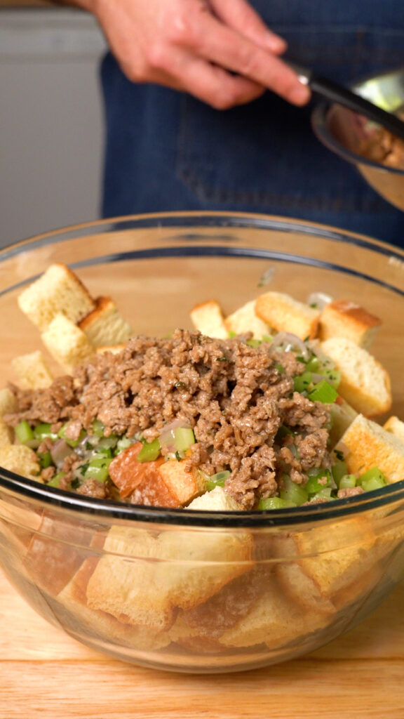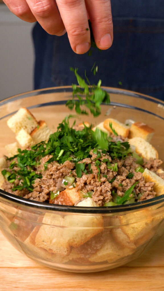 - In a large bowl, add the dried bread cubes and then fold in the sage and sausage mixture. Add in the veggie broth and fold in, then add in the non-dairy milk and vegan egg and fold in. Lastly, add in the parsley and stir to combine.