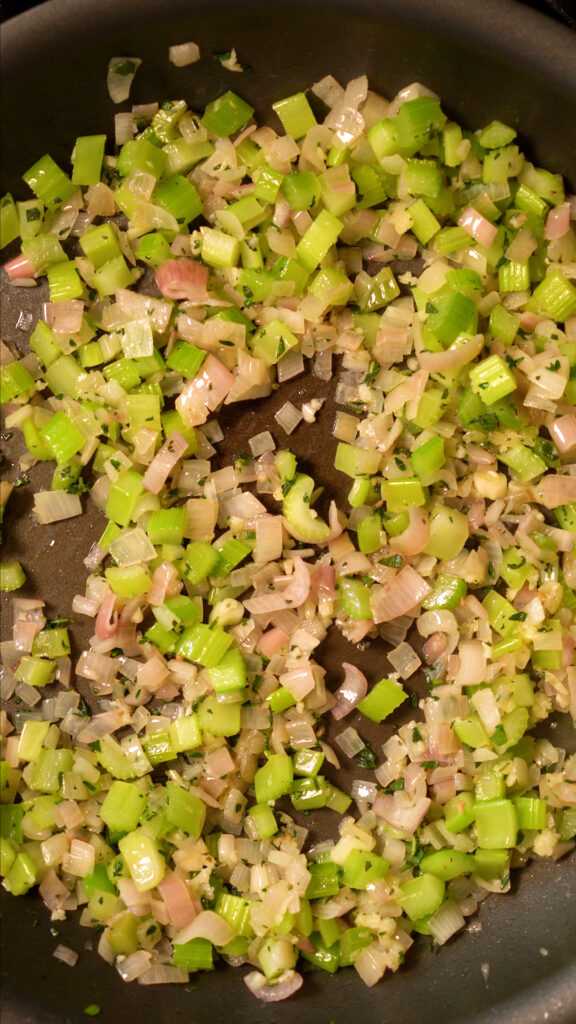 Add the vegan butter and once melted, cook the celery, shallots, garlic and herbs.
