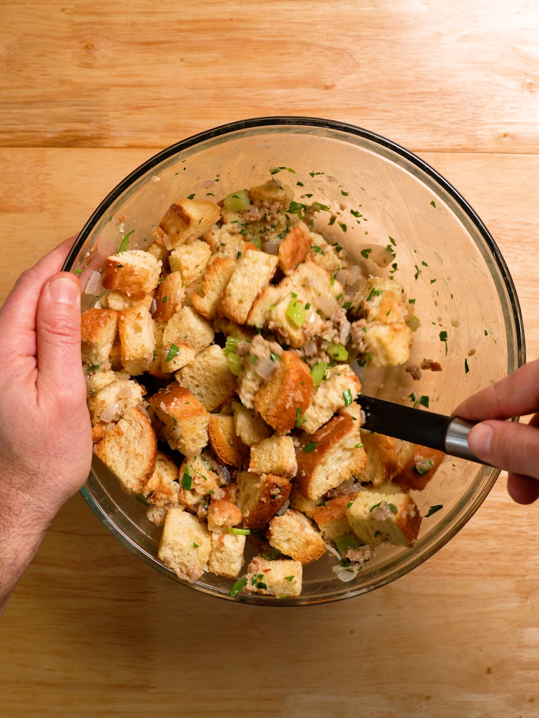 In a large bowl, combine everything, making sure to get all the bread cubes hydrated with the stock and plant milk.