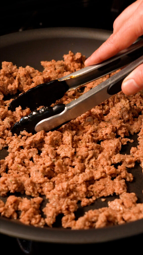 In a large skillet, over medium heat, crumble and cook the vegan sausage until browned, about 6-7 minutes. Remove from pan and set aside, don’t clean out the pan.