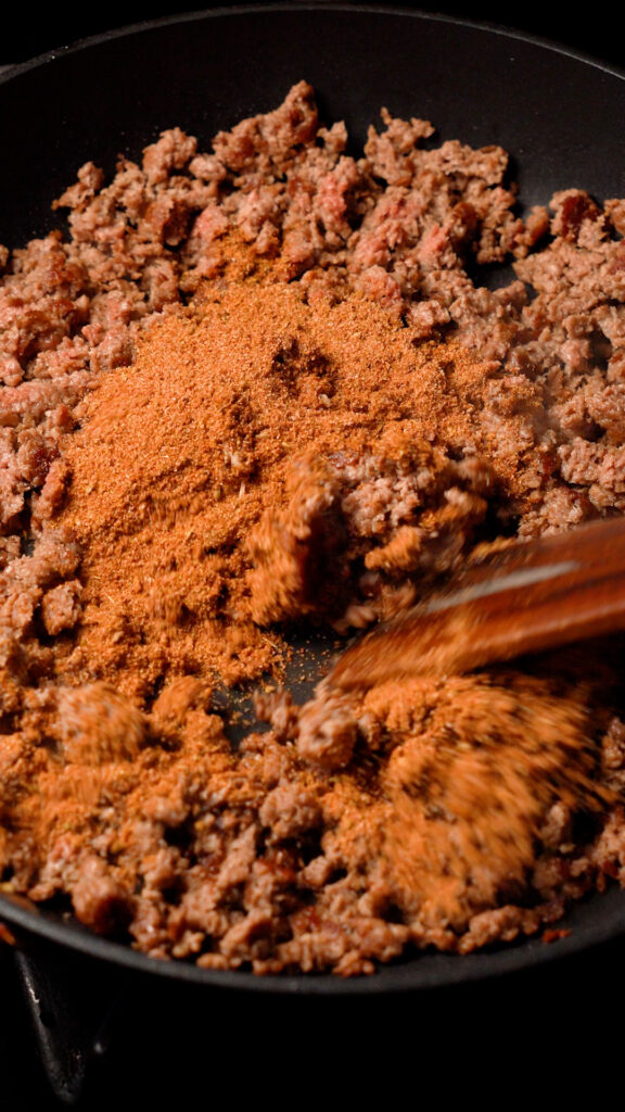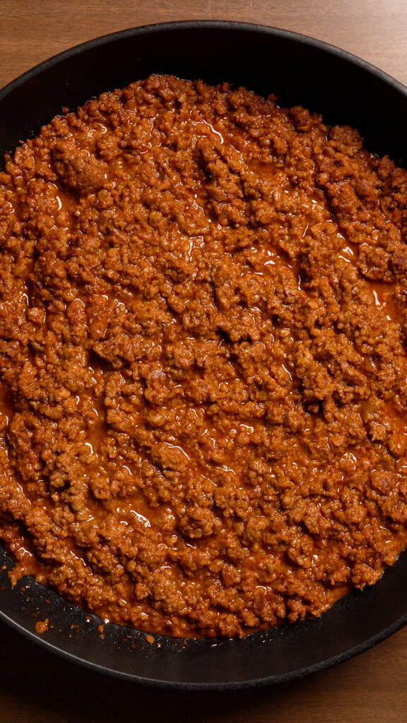 Heat up a large skillet over medium heat with a little cooking oil. Add in the Vegan Ground Beef and break it up into crumbles. Let sit undisturbed for about 3 minutes to brown. Then stir and continue to cook until it’s all nice and browned.