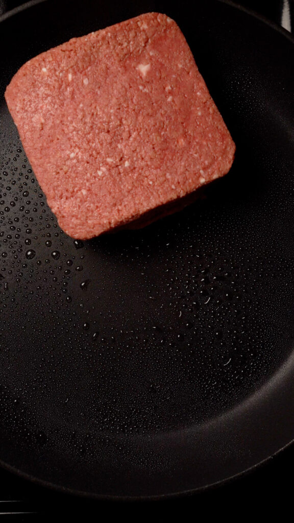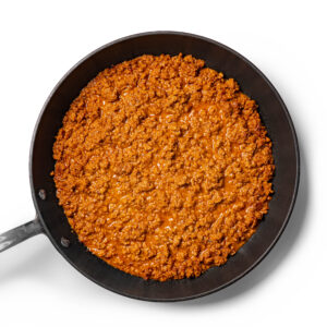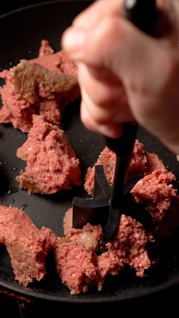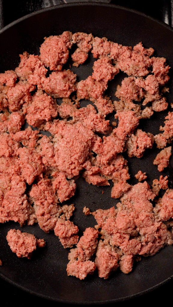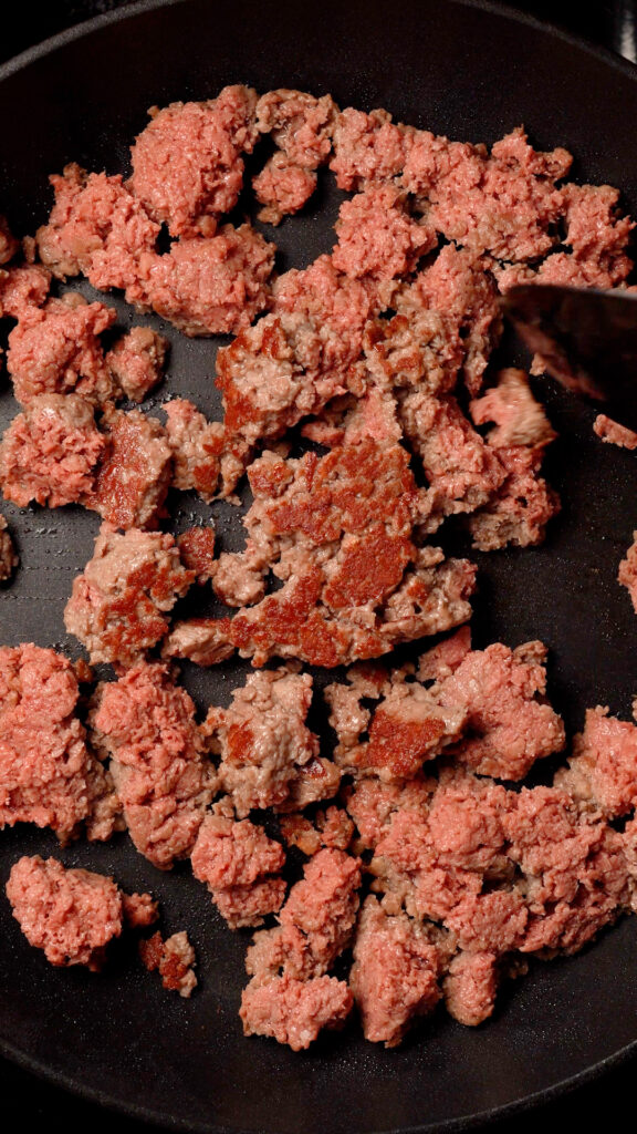 - Heat up a large skillet over medium heat with a little cooking oil. Add in the Vegan Ground Beef and break it up into crumbles. Let it sit undisturbed for about 3 minutes to brown. Then stir and continue to cook until it’s all nice and browned.
