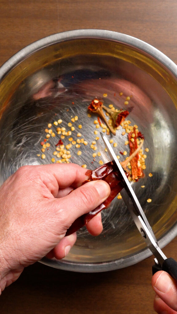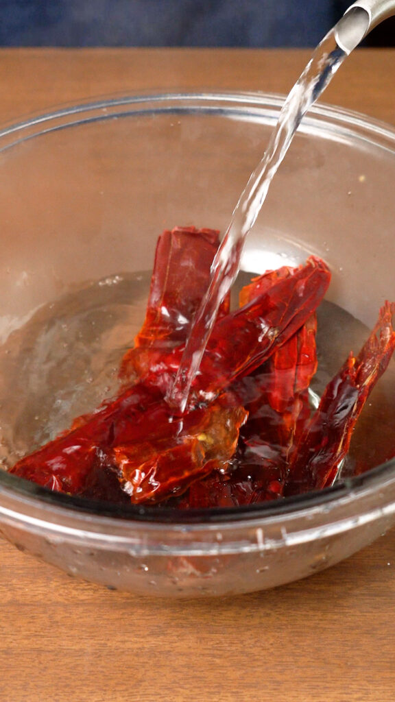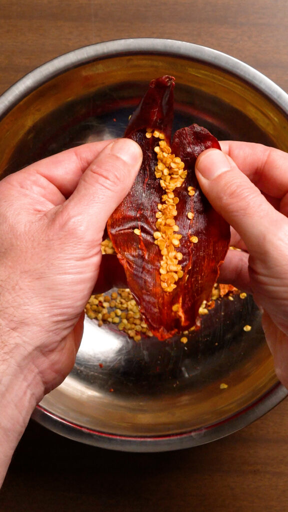 - Cut off the stems of the Guajillo peppers. Shake out the seeds, you can also cut them in half along their seams and split them open to get the seeds out as well.