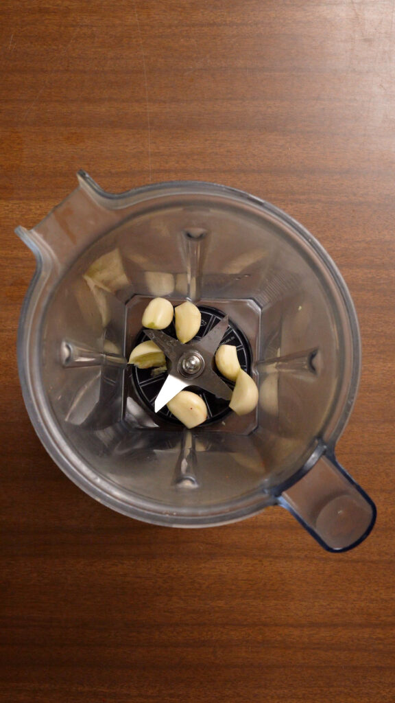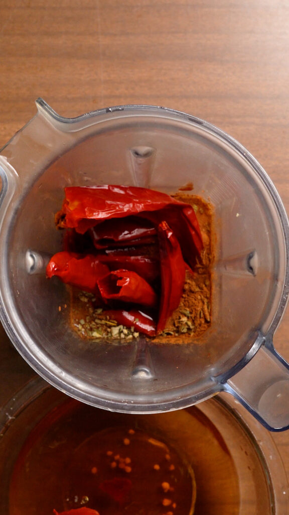 - Cover the peppers in boiling water for 10 – 15 minutes to soften them. While they soak, add the rest of the ingredients (except the pepper water) to a blender.