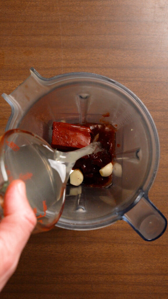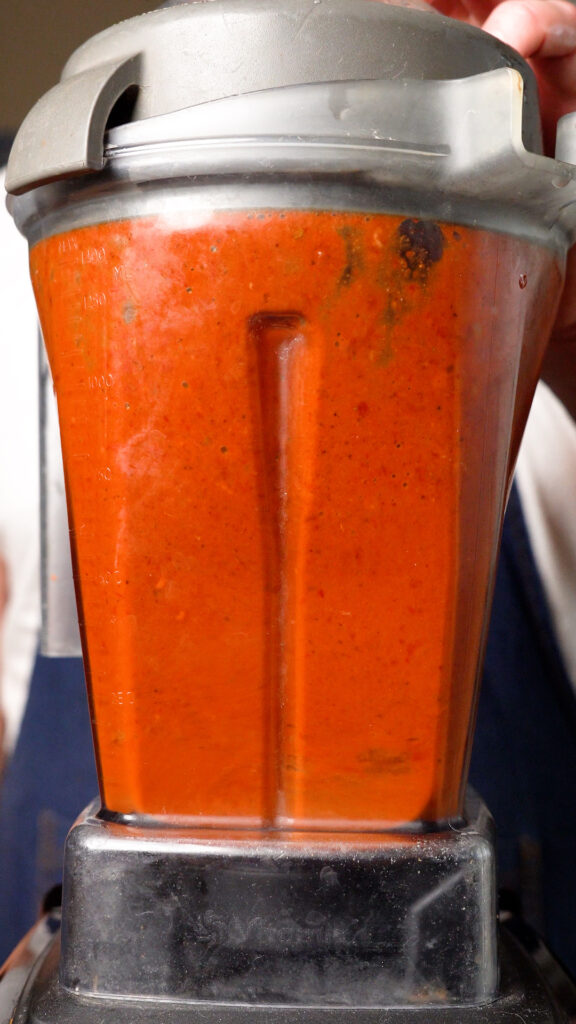 - Once peppers are softened, add them to the blender as well and blend until smooth. You can add a few tablespoons of the pepper water if it's looking too thick (I usually add 3 – 4 Tbsp worth)