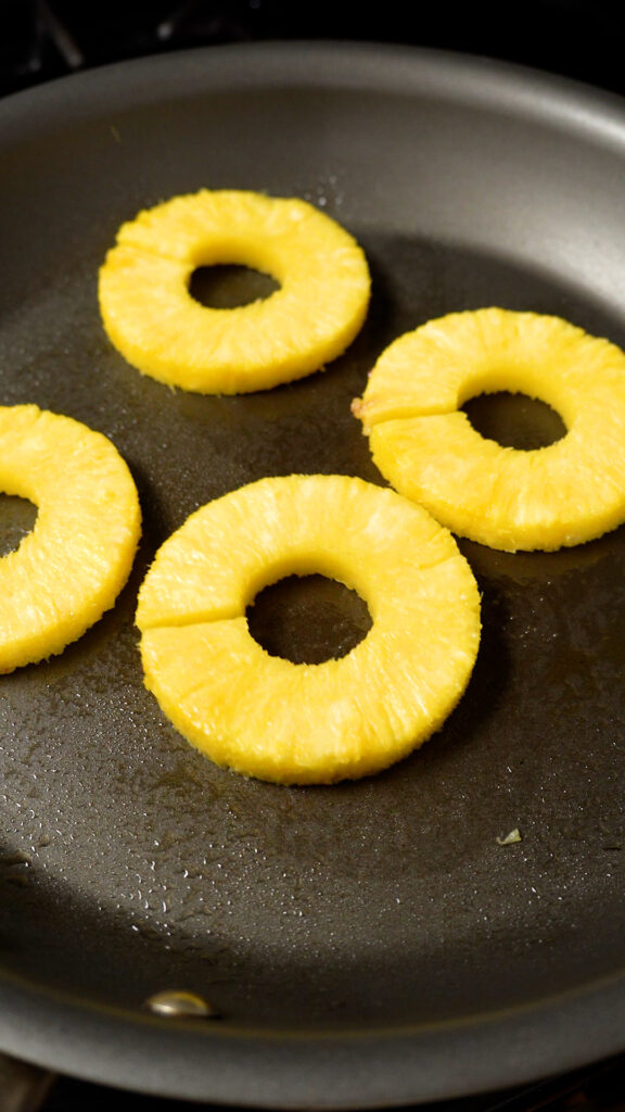 - In a pan over medium heat with a little cooking oil, grill the pineapple slices on both sides until golden brown. Remove from the pan and slice into bite size pieces.